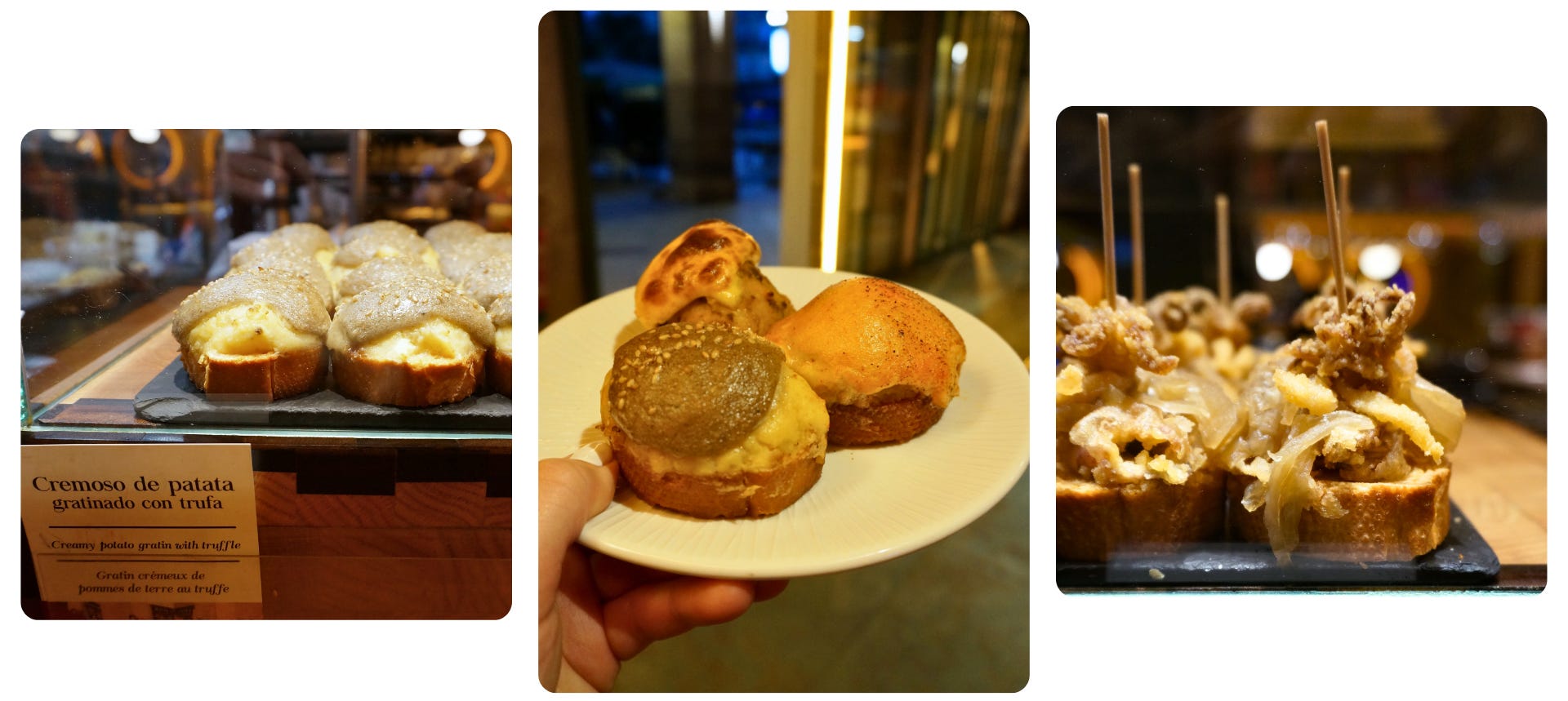 🍴 What to order: We ordered two seafood pintxos and one other Asian-style pintxo—and they were all fantastic (pictured above from left to right):